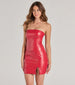 Raise the heat in a mini dress that brings the bold factor! The faux leather dress features a strapless square neckline. a mini-length hem with a side slit accent. and a bodycon silhouette to flaunt your curves. Complete the outfit with rhinestone platforms!