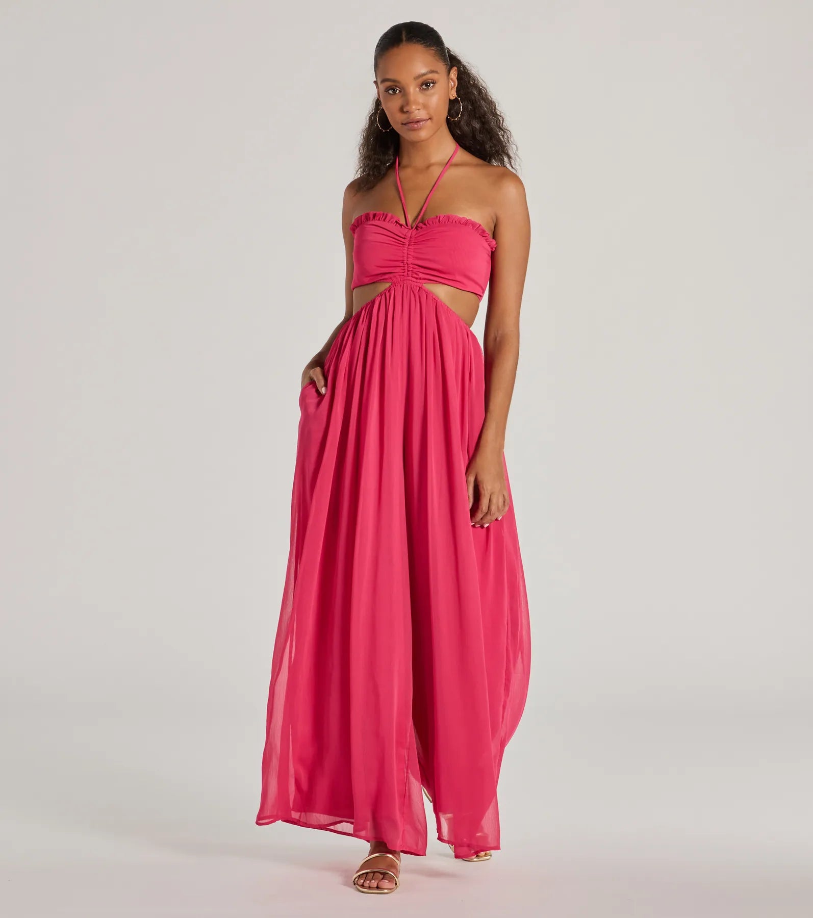 This sleeveless jumpsuit is ready to charm everyone this season! This jumpsuit features a halter neckline with a tie and strappy cutout back. The wide-leg silhouette adds a touch of breezy style to your look perfect for any occasion! Complete the look in heeled sandals.