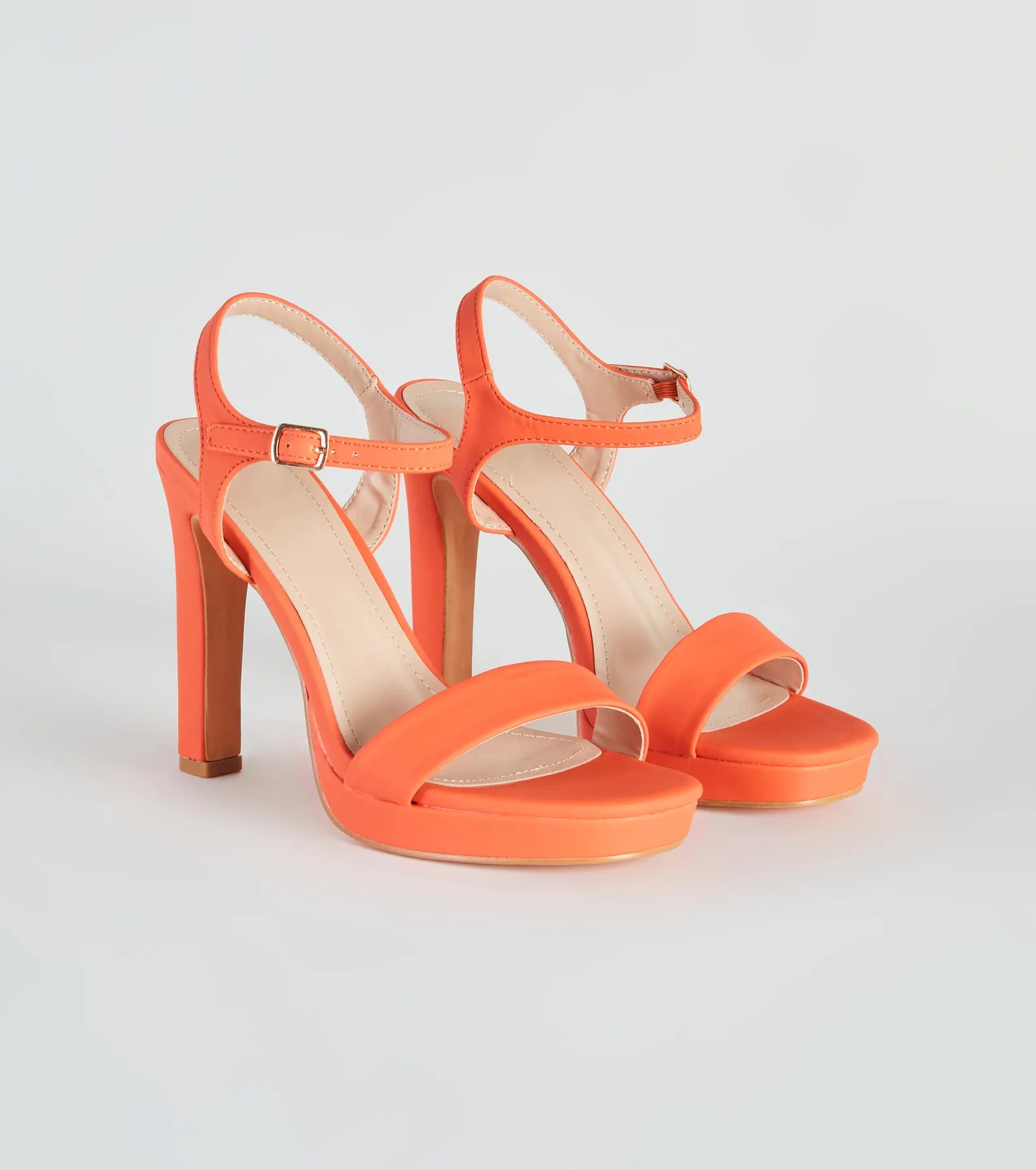 These faux leather heels have got real style! They feature a square toe. wide toe strap. a thin block heel. a platform. an ankle strap with buckle closure. and a slightly cushioned insole. Complete the look with a trendy crossbody bag for a daytime soiree!