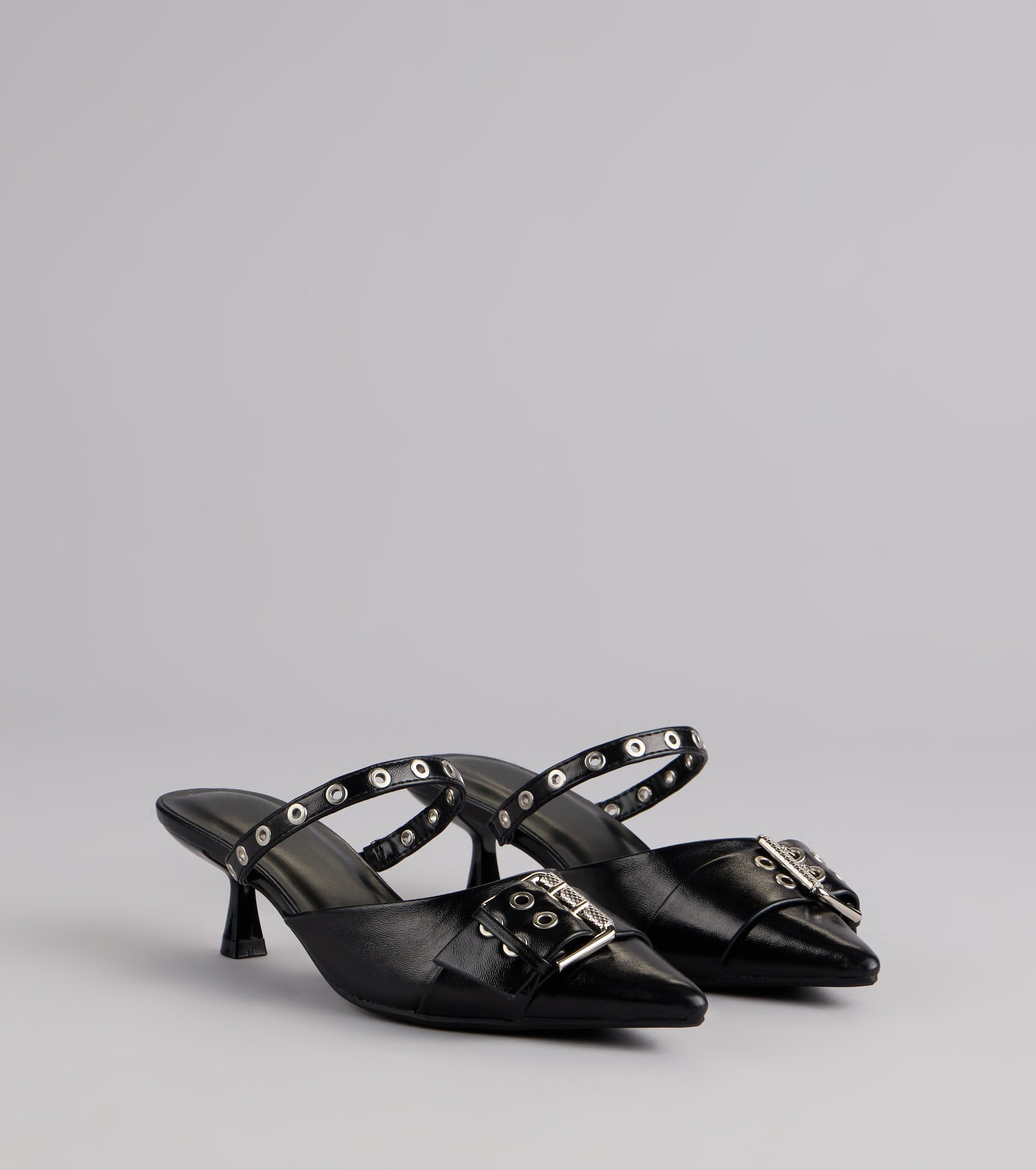 These aren't your average heels—pointed toes. edgy grommet straps. and bold buckle details bring instant attitude. Perfect for taking your outfit from low-key to don't mess with me in one step.
