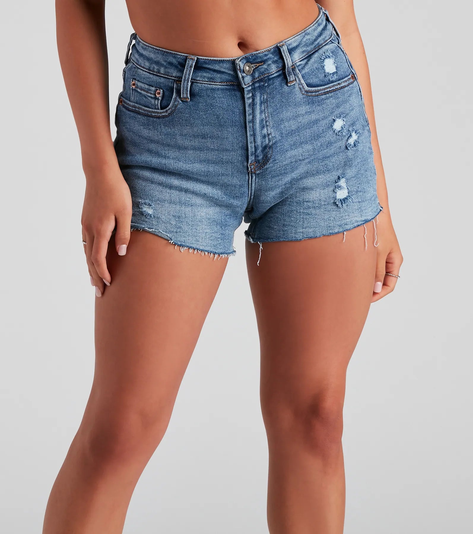 The Remy distressed denim shorts are a classic staple for casual everyday looks. They feature a high-rise waist. subtle destructed detailing. and a raw-cut hem. The shorts offer a semi-cheeky fit with a moderate stretch. Style with a crop top and sandals.