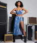 Amp up your fab concert outfit with this trendy high slit patchwork denim maxi skirt! Designed with a faded patchwork pattern on the denim fabric. you'll create that perfect retro look. The skirt is shaped with a high waist leading to a maxi-length hem with a high-cut arched side slit on the slim-fit silhouette for an alluring vibe. Complete your 'fit with the matching bustier top!