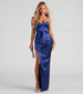 Bring the glamorous energy in the gorgeous Reyna satin formal dress! She features a sleeveless sweetheart neckline with dazzling iridescent heat stone embellishments. a pleated and padded bust. and adjustable spaghetti straps for a customized fit. The corset-designed bodice leads to a high waist seam with ruching. a curve-hugging floor-length skirt. and a thigh-high side slit. Complete the look with glitter heels.