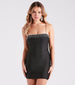Get ready to turn heads on the dance floor with this sleek mini dress! This clubbing night-out sensation features a sleeveless square neckline adorned with a mesmerizing rhinestone fringe trim that catches the light with every move. The bungee spaghetti straps lead to a captivating low back with a cross-back design. while the mini-length hem and bodycon fit accentuate your curves in all the right places. Crafted from a satin-knit fabric with plenty of stretch. this dress ensures both comfort and style. Style with a sticky bra for a flawless and confident look.