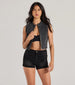 This sleeveless moto denim vest features a standing collar neckline with button closure. a front zip-up closure adding stylish functionality. and a cropped hem. Perfect for layering over your favorite tees.