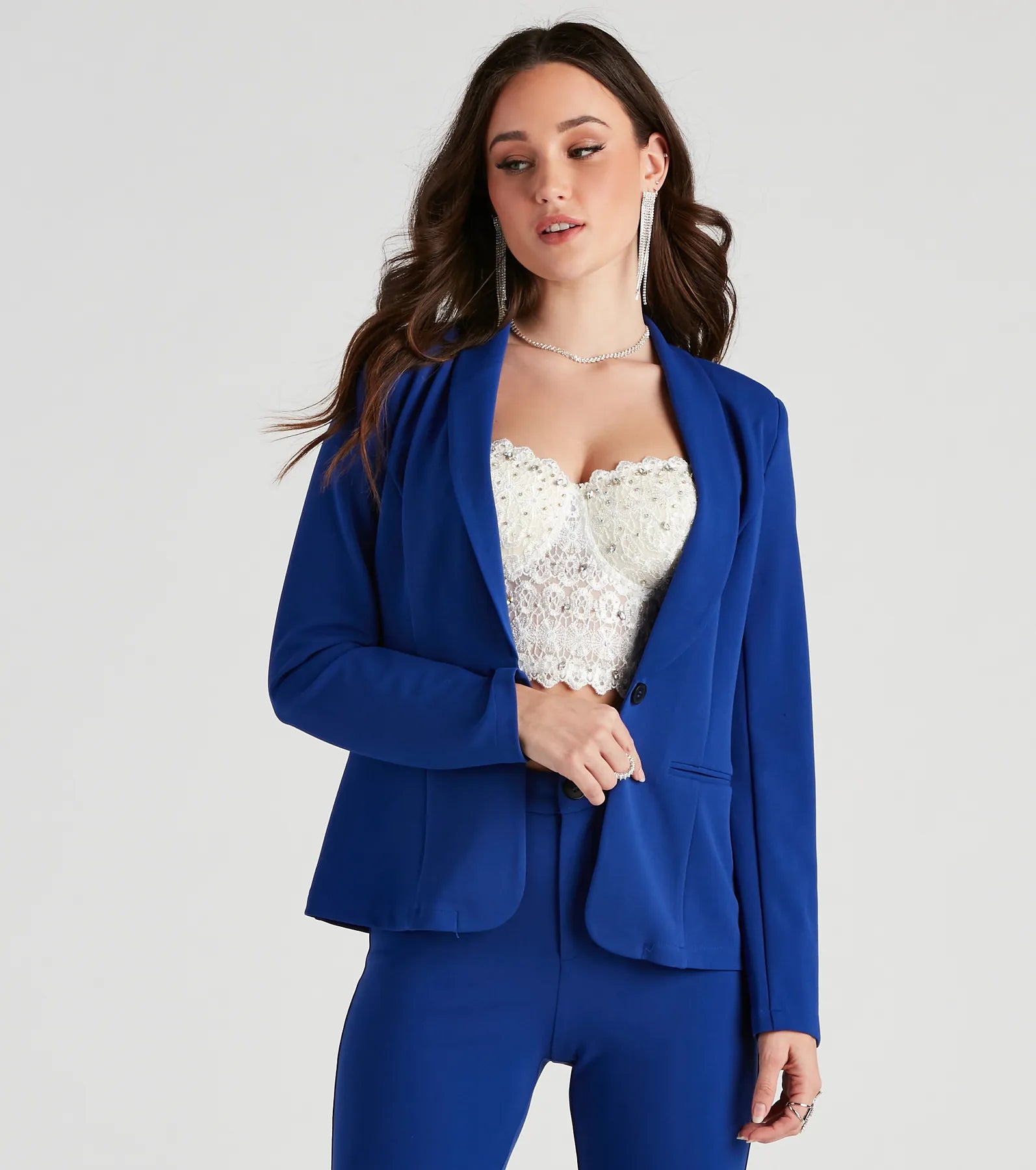 You'll make all the right moves in this boss babe crepe blazer featuring long sleeves. shoulder pads. lapel collar neckline. front button closure. and faux pockets. Complete the look with matching bottoms for a business lunch!