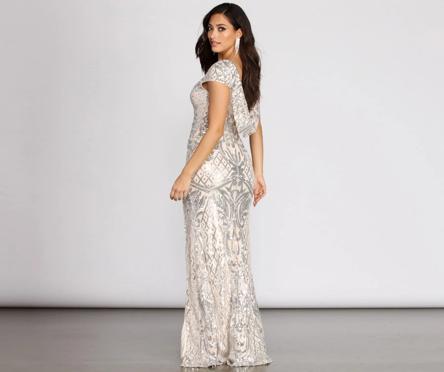 Show off those glistening sequins in our radiating Riva dress! She features a crew neckline. cap sleeves. a chic draped cowl back. a high waist seam. and a floor-sweeping hem with a thigh-high front slit. The sheer mesh fabric has all-over sequin embroidering in a geometric pattern and includes a full knit lining. Complete your look with new heels and you'll be ready for your moment to shine.