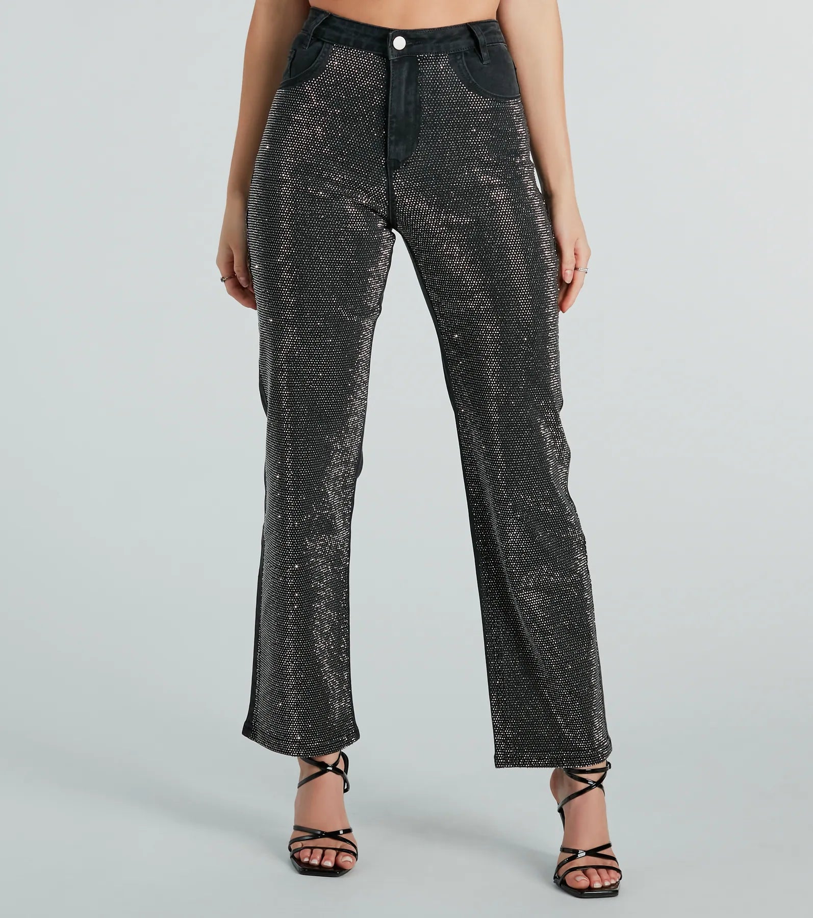 Look and feel like a rockstar in these shining rhinestone jeans! They feature a flattering high-rise waist. straight-leg silhouette. and front rhinestone embellishments that bring the bling. Complete the look in a mesh bodysuit for going out!