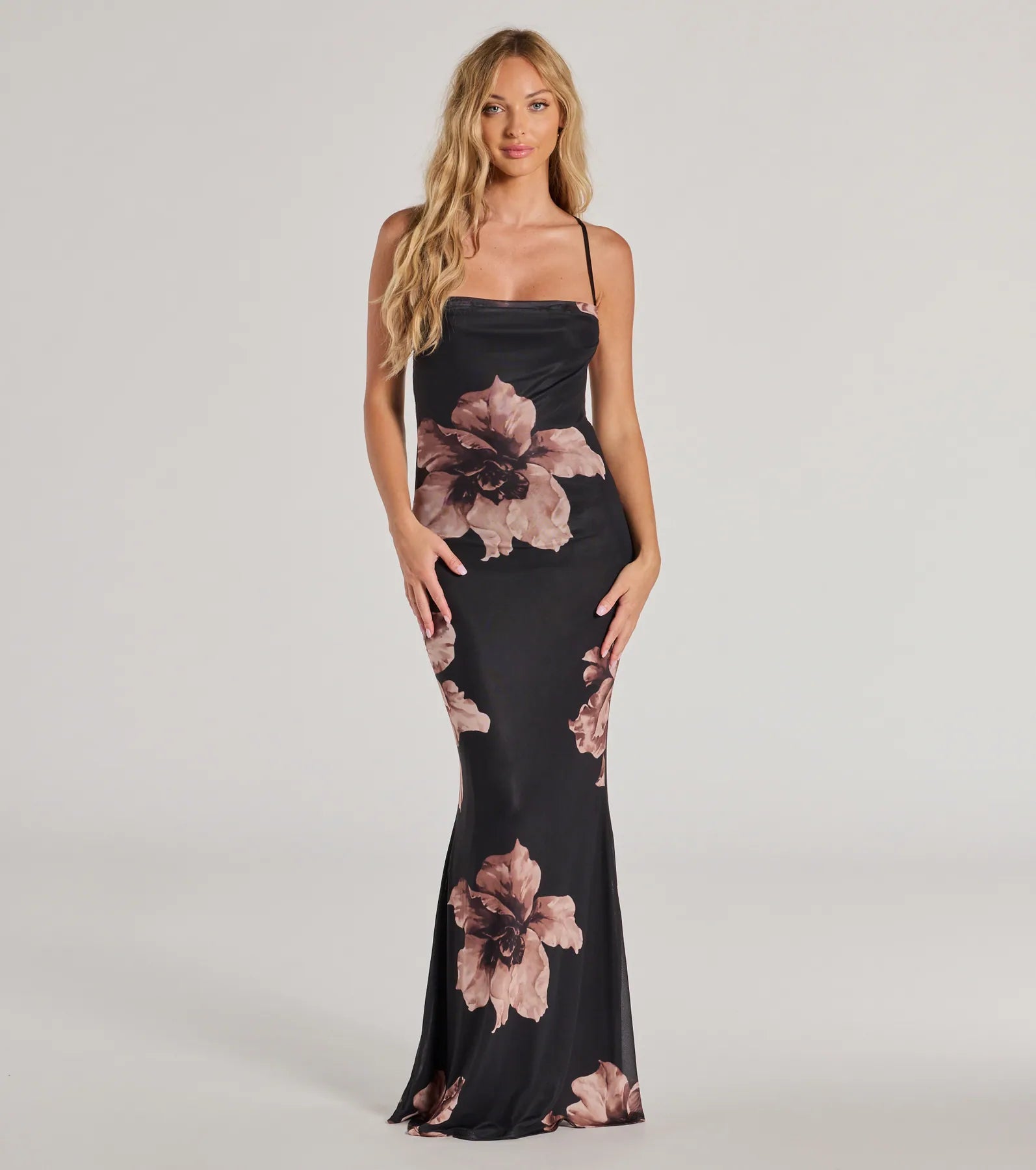 Usher in the romance with a long mesh dress that features a sleeveless cowl neckline. spaghetti straps. a floral print. a bold lace-up back design. and a mermaid silhouette. Complete your gorge fit with platform heels for the ultimate date night look!