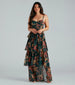 The Rosie formal floral dress combines bohemian style with romantic vibes perfect for shifting into autumn events and occasions! She features a sweetheart neckline adorned with ruched spaghetti straps. a padded bust. and a flattering A-line silhouette with a lovely tiered ruffled long hem with a flirty slit. The formal dress is designed with a blooming floral print on airy chiffon fabric with a smooth woven lining. Complete the look with sleek hoop earrings for weddings. banquets. and dressy birthdays!