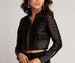 You're a little rough around the edges. This cropped moto jacket features a mock neckline. a full zip up front. functioning zipper details on the sleeves. and sheer mesh stripes. Jacket is composed of a faux leather fabric and has little to no stretch.