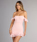 Soft. sweet. and a little bit spicy—this off-the-shoulder ruched mini dress is your go-to for any RSVP where you want to look effortlessly flirty. The ruffle trim keeps it playful while the body-hugging fit brings the sultriness.