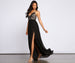 Impress in lace with a formal dress that is part bold. part glam. The dress features a sleeveless V-neckline. a scalloped lace bodice. adjustable spaghetti straps that cross at the back. and an A-line silhouette with a high side slit. The dress is composed of a lined chiffon fabric that offers a form hugging fit with minimal stretch. Complete look with rhinestone heels and a clutch.Â
