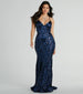 Catch the light and attention in the beautiful Saskia sequin satin formal dress that dazzles in luxury at prom. black tie galas. and weddings! This exquisite gown boasts a plunging V-neckline for a sultry touch. padded bra cups for support. and spaghetti straps for a flawless fit that lace up in the back. Her mermaid silhouette adds a touch of elegance. while the bonded floor-length hem and sequin-scroll embroidered silky satin fabric create a truly opulent piece. Finish the look with this stunning gown with a lariat necklace. bracelet. and heels for a striking style!