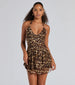 Show off a sassy allure in this leopard print mesh mini dress featuring a plunging V-neckline and tie-back halter straps with sleek O-ring accents. The fitted ruched bodice leads to a subtle asymmetric drop waist seam and a short tiered A-line silhouette for an adorable flair.