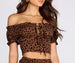 Sassy and spotted. you'll love this adorable crop top! It features an off the shoulder sweetheart neckline with short cuffed sleeves with ruffle trim detailing. a front keyhole cut out with a tie closure. a stretchy smocked back. and a short. cropped fit. The top is composed of a lightweight woven fabric with a cute all over animal print. Complete your sassy look with the matching mini skirt!