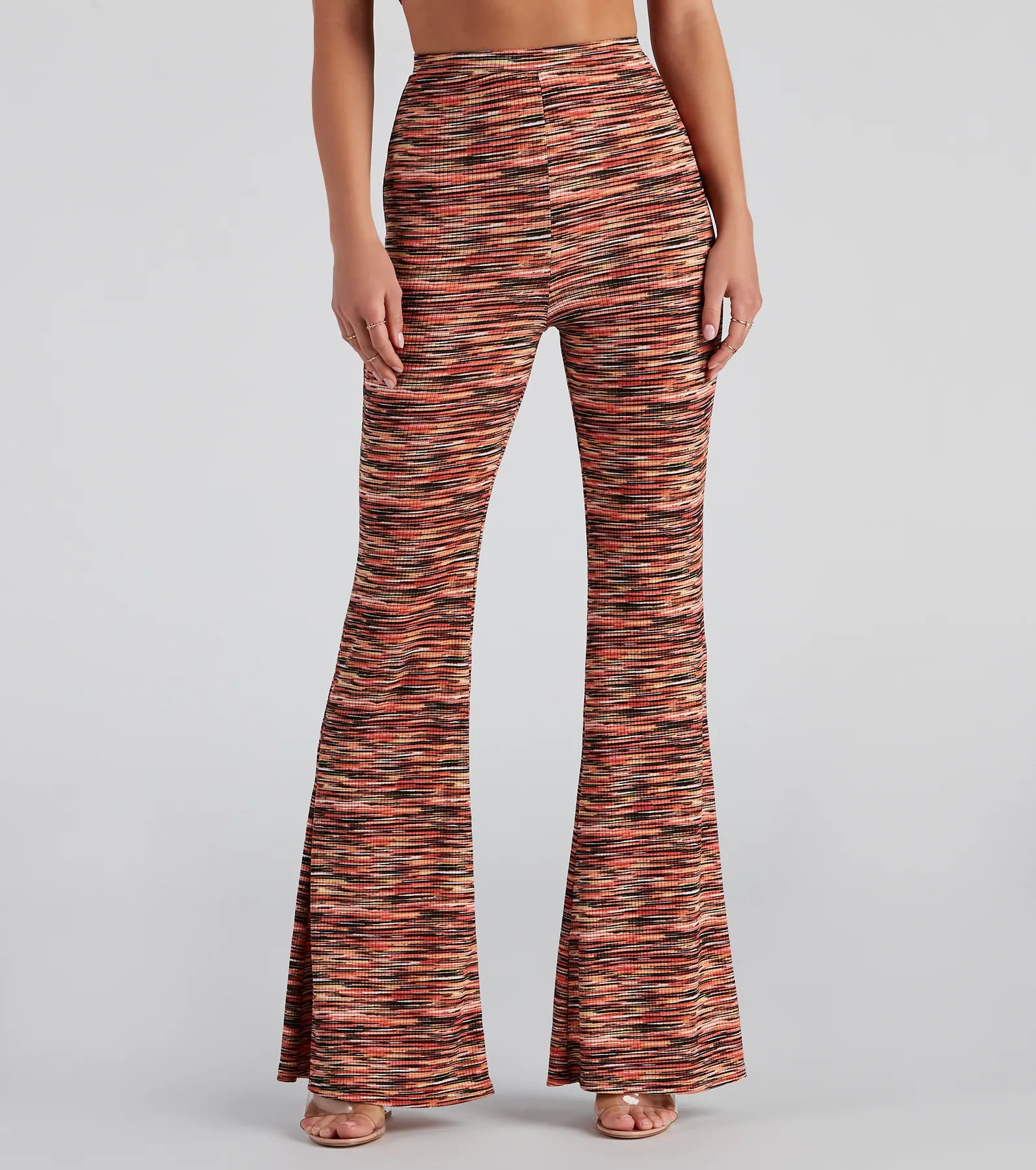 So much sass on these flare pants! It features a high-rise waist. form-fitting silhouette. and a flared hem on space-dye knit fabric with plenty of stretch. Complete the look in the matching top and heels.