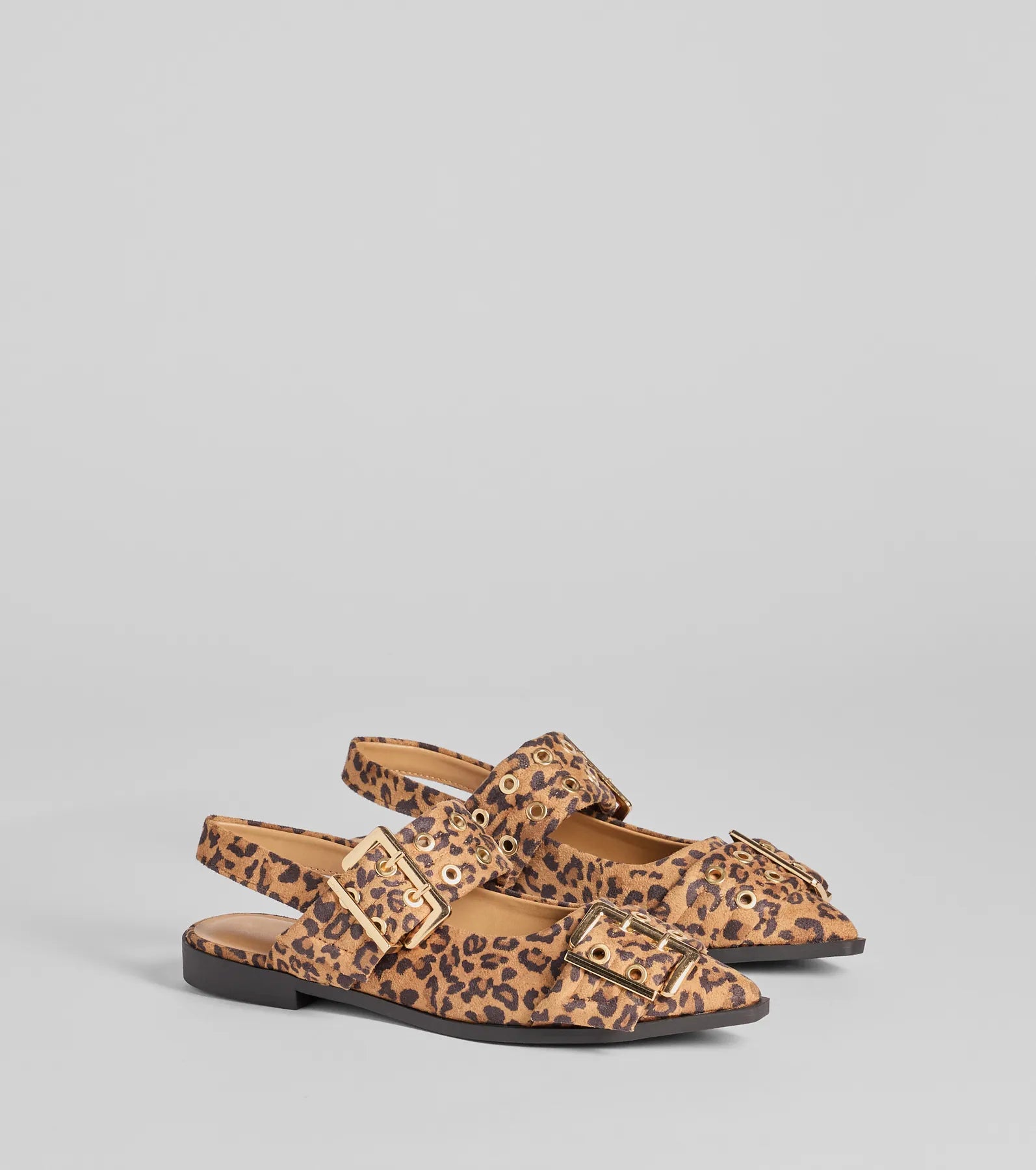 Flaunt your fierce style in these leopard print buckle strap flats shoes. Featuring a chic pointed toe. buckle details. and sling-back strap for ultimate comfort and flair.