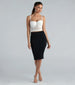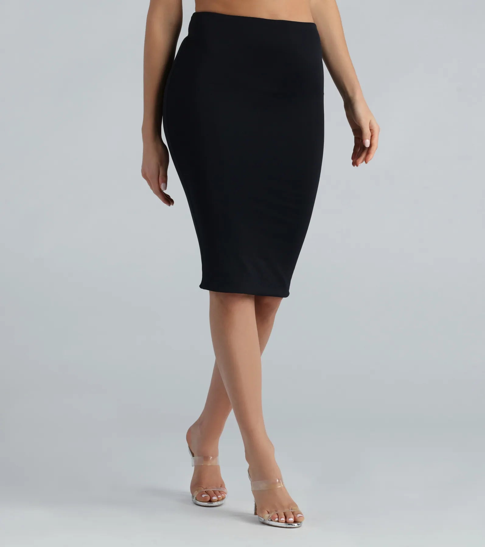 This seamless smooth knit pencil skirt is a forever staple to have in your closet! It features a high-rise waist. a midi-length hem. and a form-hugging silhouette to showcase your curves. The buttery soft smooth double-lined knit fabric offers plenty of stretch for ultimate comfort. Dress the pencil skirt up with a corset top and clear mules for happy hour!