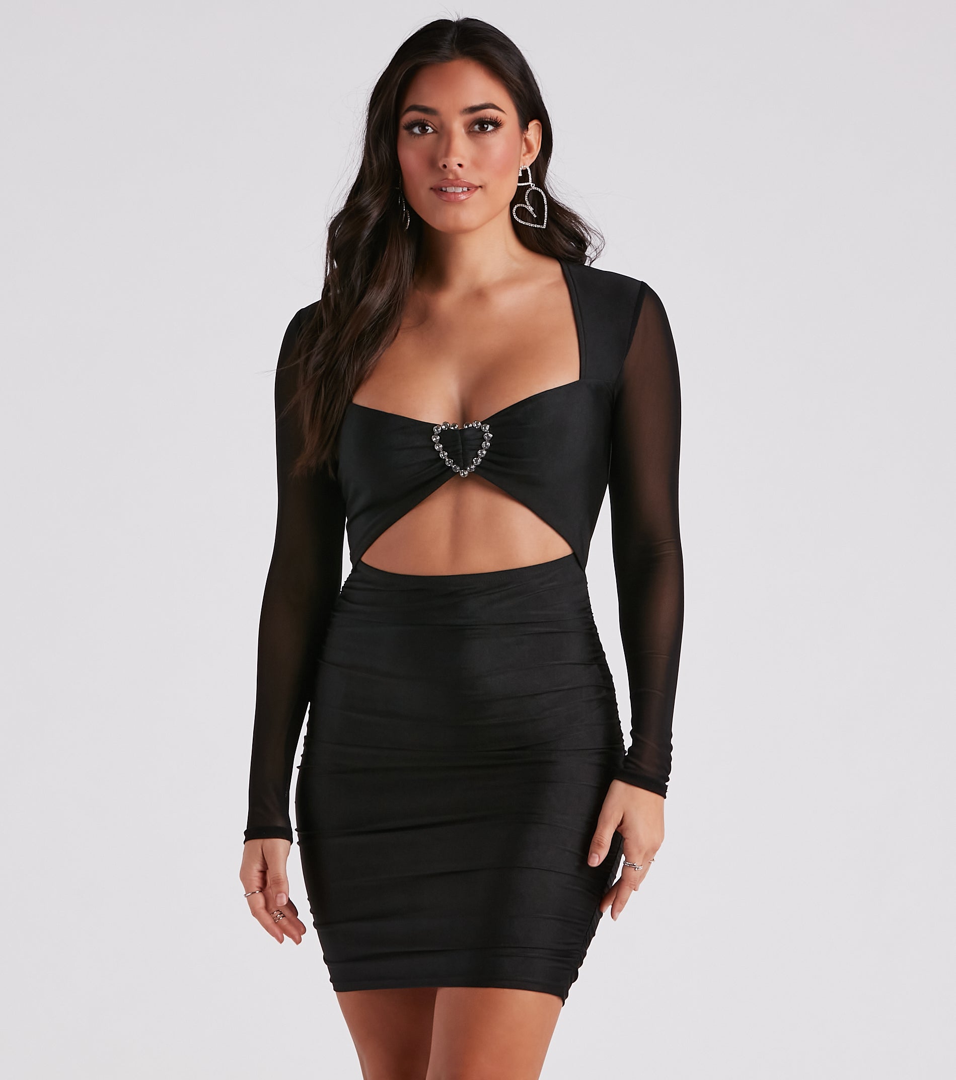 You'll have all the secret admirers after you step out in this sultry and stunning mini dress! It features a sweetheart neckline with a glam rhinestone embellished heart-shaped accent. sheer mesh long fitted sleeves. an eye-catching waist cutout at the front. ruching down the side seams. and a mini-length. curve-hugging silhouette. The smooth knit fabric offers plenty of stretch. Complete your look with sparkly platform heels.