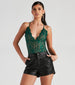 You can be found in this lace scallop bodysuit all season long! It features a sleeveless v-neckline. adjustable spaghetti straps that cross in the back. an open back. and a thong-cut bottom with dual snap-button closures. Complete the look in a chic crop blazer.