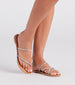Everyone will catch sight of your sparkle in these trendy flat sandals featuring a sleek almond toe. rhinestone embellished dainty and strappy design and a faux leather footbed. Style with a glitter crossbody purse to complete the look!
