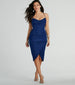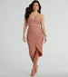 Turn heads with your glitzy allure at a cocktail party in the Selene lace-up ruched glitter formal midi dress! Designed with a stretchy glitter knit fabric. this gorgeous dress will glimmer up the night. Her sleeveless bodice is shaped with a sweetheart neckline with a cowl-draped overlay for a chic touch and a built-in padded bust. Her spaghetti straps lead to an open back with a cross-back lace-up strappy design so you can find your perfect fit. The front ruching detailing will accentuate your curves on her form-hugging fit. The wrap-front design creates a stylish asymmetric hem on the mid-length silhouette. Complete your stunning look with rhinestone metallic heels.