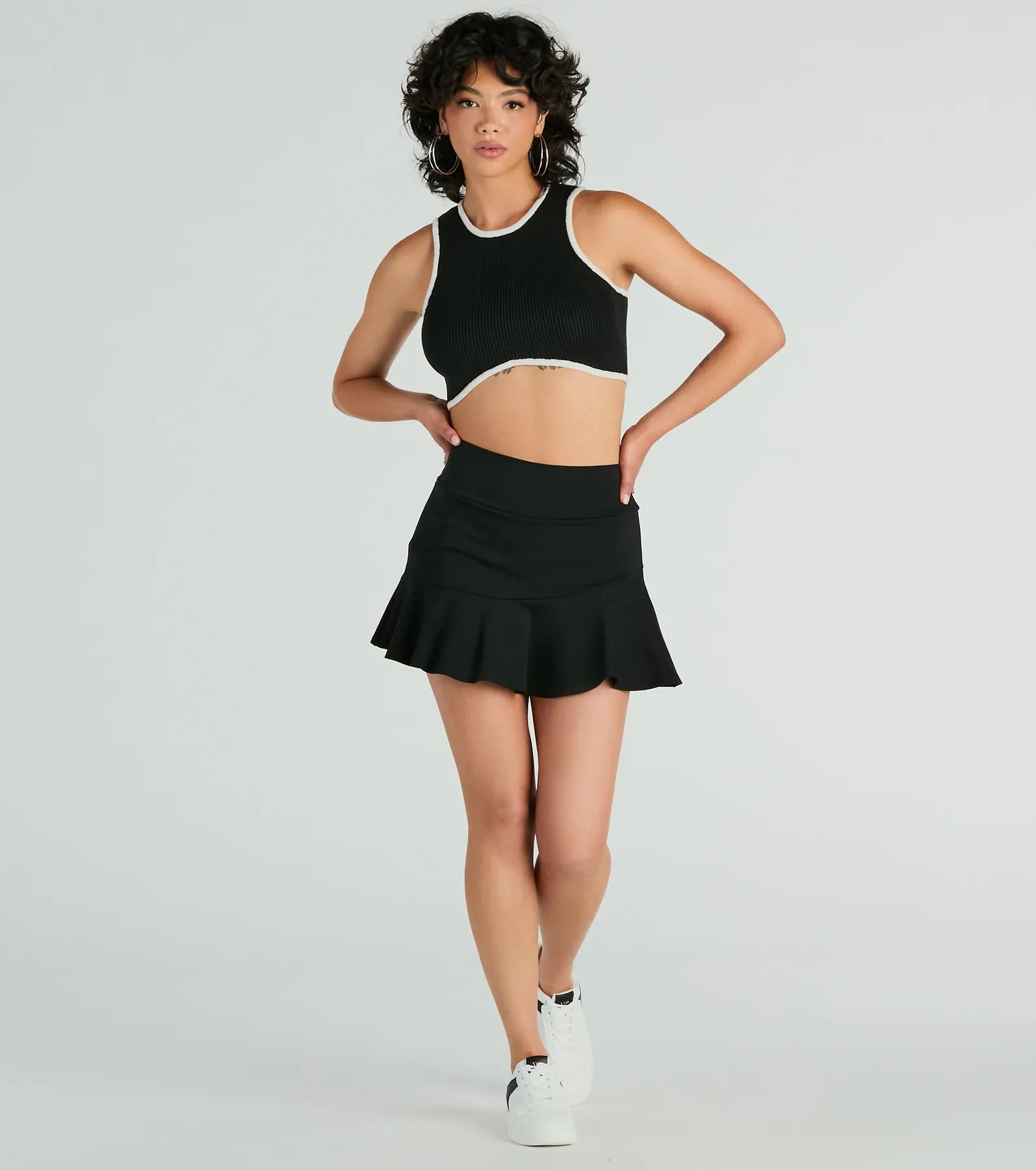 Instantly become a sensational sight in this knit mini skort perfect for rooftop cocktails! Made with smooth knit fabric and shorts lining for ultimate comfort The high-rise waist and form-hugging fit will accentuate your curves. while the ruffled mini-length hem adds a touch of fun and flirty flair. Complete the look in a corset top and heels.