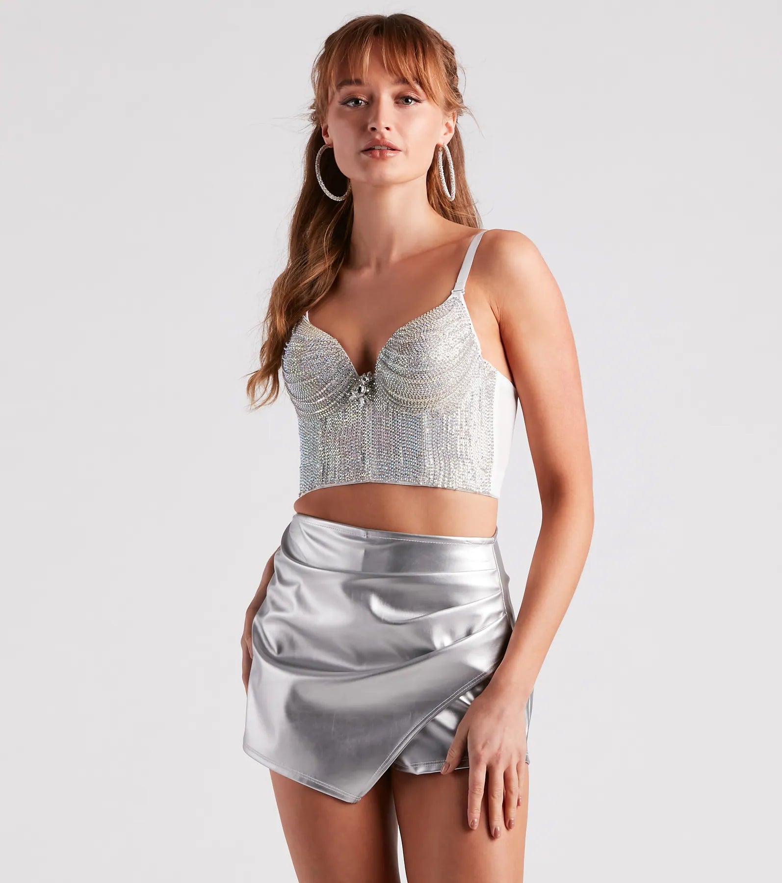 Let your sultry side shine in the night slaying it in this rhinestone corset for chic club nights or holiday parties! The corset features a sweetheart neck. detachable and adjustable straps. a padded underwire bust. flexible boning. a front rhinestone fringe design. back hook-eye closures. and non-slip grip lining. Pair with sleek skinny trouser pants and heels for a gorgeous going-out look!