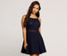 Dazzling details make our elegant navy crepe Hattie dress truly eye catching. She features a high neck. lace and mesh bodice with sequin detail. spaghetti straps. and single-button closure with cutout at nape of neck leading to a back zip. Her waist features crisscrossing solid crepe panels with mesh inserts leading to an A-line. inverted-pleat skirt with pockets at either hip. Hattie is fully lined and made from a mid-weight woven material with a touch of stretch.