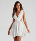 This flare mini dress sets the bar high! Showcase your daring side in this sleeveless dress featuring a plunge v-neck on the front and back. a smocked bodice. and side elasticized bar cutouts that lead to a flirty mini-length hem. Complete the look in wedges and dainty earrings.