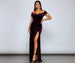Stun in luxe velvet as you make a breathtaking impression in our Shania dress! She features an off-the-shoulder neckline. a wired sweetheart bust with padded cups. off-the-shoulder short sleeves. and an A-line silhouette accented with a high side slit. The dress is composed of a lined velvet fabric that offers a form hugging fit with a moderate stretch. Complete look with rhinestone heels and a sleek clutch.