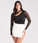 Discover this sexy crop top with eye-catching detail for maximum impact wherever you wear it! The top features sheer mesh fitted long sleeves. an asymmetrical cut neckline. a cutout bust. and a fitted crop hem. Complete the look in sultry faux leather shorts for a GNO!