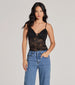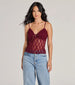 Everyone will notice how sultry you look in this lace crop top perfect for adding romance into your style! Adorned with delicate spaghetti straps. a playful V-neckline with a ribbon tie. and a sheer fitted crop hem. Complete the look in high-rise jeans for a casual date night.