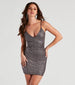 Shine on bby! This glowing mini features a sleeveless bodice. a V neckline. spaghetti straps and vertical princess seams. The back features a scoop back design accented with a triple-row bar strap detail. The slim fit bodice leads to a flared skater length silhouette. Dress is composed of a lined glitter knit fabric that offers a form hugging fit with a moderate stretch. Glitter may transfer.