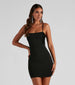 Short and sweet. your curves deserve a moment! Look chic in this mini ponte dress designed to hug and flatter your figure on a sleeveless square neckline. adjustable spaghetti straps. and ruched mesh side accents that lead to the form-hugging fit. Complete the look in statement earrings for a club night.