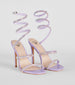 Show off your signature glam style with these radiant rhinestone spiral stiletto heels! They feature an open square toe. a double strap design across the foot. a trendy spiral strap design that wraps around the leg. mini rhinestone embellishments on the straps. and a tall stiletto heel. The faux leather material features a stunning metallic sheen. Pair these heels with a party dress and a sparkly clutch!