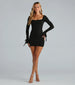 A simply amazing little black dress you'll adore wearing on dressy occasions! It features a square neckline. long bell sleeves with trendy ruched adjustable ties and slit accents. a flattering bodycon silhouette. and a mini-length hem. The dress is composed of a double-lined soft brushed knit fabric. Complete the look with a chic mini purse and heels.
