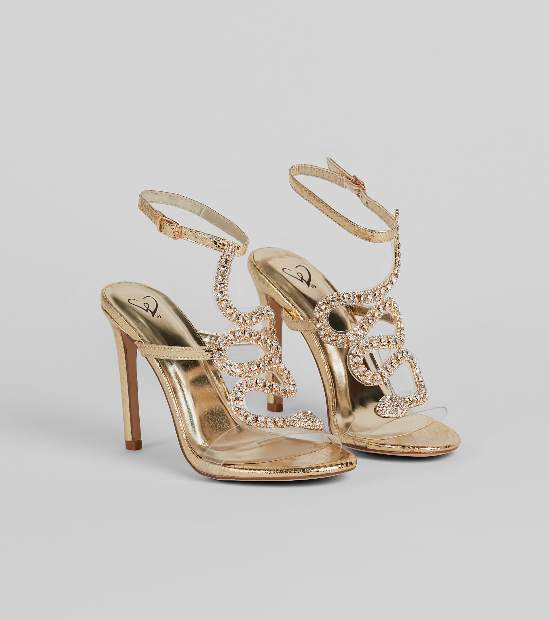 Slay every step in these sleek jeweled snake stiletto heels! They feature an open almond-shaped toe with a clear strap. an asymmetric clear strap across the foot with an intricate snake design. varying-sized rhinestone embellishments. an adjustable ankle strap. and a stiletto heel. The faux leather material has a fab snake print trim and a chrome sheen. Create an iconic look with these heels. a bodycon dress. and gold jewelry!