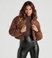 Slay the chill and your fit' by layering on this quilted puffer jacket featuring long sleeves with elasticized cuffs. a standing collar neckline. front zipper closure. side pockets. and an adjustable drawcord crop hem. The jacket is composed of nylon-woven fabric with insulation to help keep you warm and protected from the elements. Complete the look in trendy lug boots.