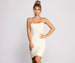 Slay it in a ribbed knit dress that stuns for your next date night in! The dress features a sleeveless square neckline. sleek bungee straps. and a curve-hugging midi-length silhouette. Complete look with clear mules.