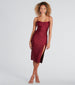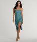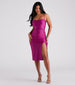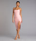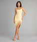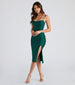 Simple and sleek. this smooth knit midi dress is a perfect choice. It features a sleeveless cowl neckline. spaghetti straps. a high waist seam. a form-hugging silhouette. and a chic high front slit to showcase some leg.Â