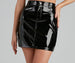Take your wardrobe in a sleek direction with this mini skirt featuring a high-rise waist with button and zipper closure. faux pockets. composed of a patent leather fabric with minimal stretch. Style with a beaded corset for a date night.