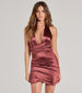 This silky-sleek satin mini dress features a deep V-neckline accented with tie-back halter straps. a pleated asymmetric overlay for a chic touch. and a bold open back. The ruched wrap-front design and bodycon silhouette will showcase your stunning curves. Perfect for a night out. style with stiletto heels.