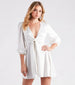 This sleek satin mini dress is a chic option for holiday parties this season! It features a V-neckline with a tie-front detail. quarter-length sleeves. a high waist seam. and a short flowy skirt with an A-line silhouette. Style this dress with hoop earrings and cute mules.