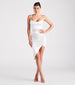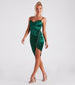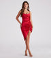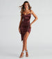 Showcase a sleek sheen in this gorgeous satin midi dress! The knee-length dress features a sleeveless cowl square neckline with pleating. adjustable spaghetti straps for a customized fit. and ruched detailing. A sparkly rhinestone trim cascades from the side to the front leading to a midi-length. asymmetrical hem creating a chic side slit to show off your legs. Style this curve-hugging dress with metallic heels for your next fancy date night.
