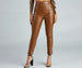 Step up your look with these sleek faux leather leggings. They feature a flattering high waist. vertical seams that lead to a trendy split hem design. and a form-hugging fit. Style these leggings with a cropped sweater and ankle booties.