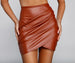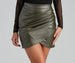 Elevated and sleek. this faux leather mini skirt will step up your style. It features a high-rise waist. a ruched wrap-front design. and a short. curve-hugging silhouette. Pair this skirt with a cropped bustier.