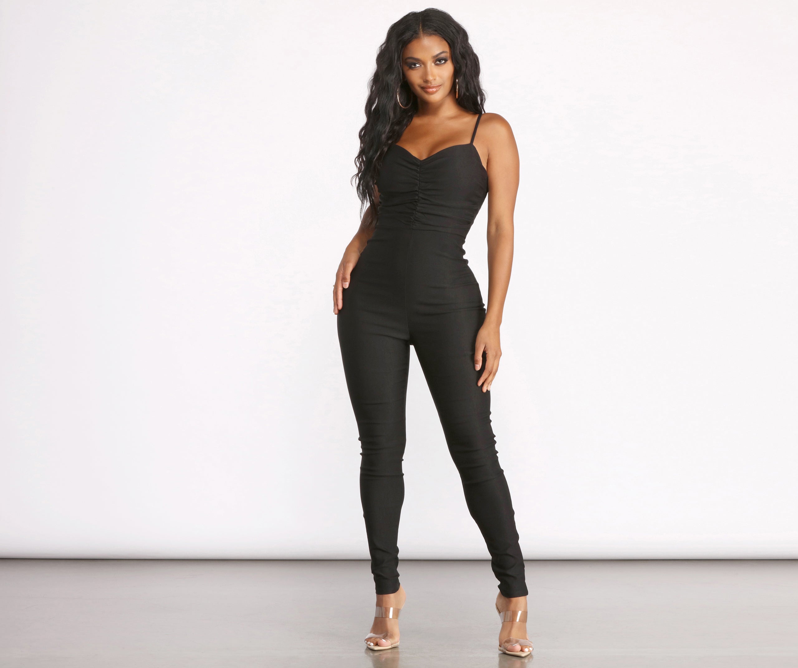 Sleeveless Sweetheart Neck Ruched Tapered Catsuit