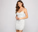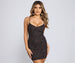 Keep it dreamy with a floral mini dress that brings the romance. The dress features a sleeveless V-neckline with a ruched center. spaghetti straps. a ditsy floral print. and a mini-length silhouette. The dress is composed of a lined ribbed knit fabric that offers a form-hugging fit with a moderate stretch. Complete look with wedges.